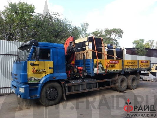 Готовые термопанели поступают через ОТК на склад, где складируются на специализированные поддоны и упаковываются. Далее грузятся на машину с манипулятором и доставляются заказчику.