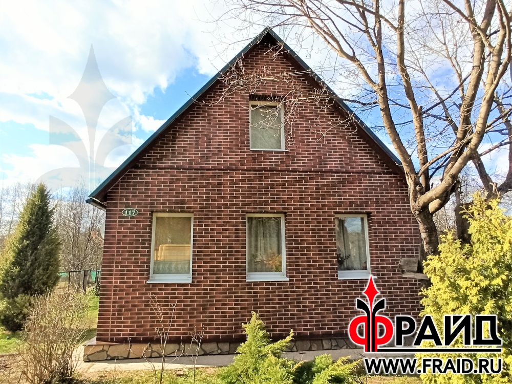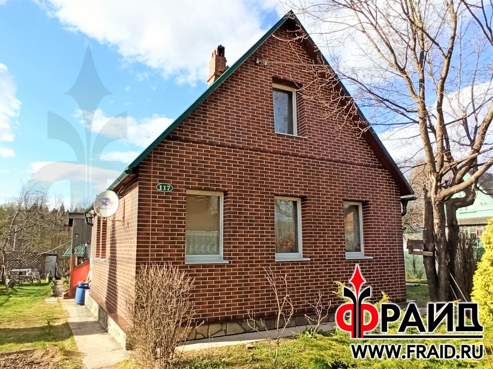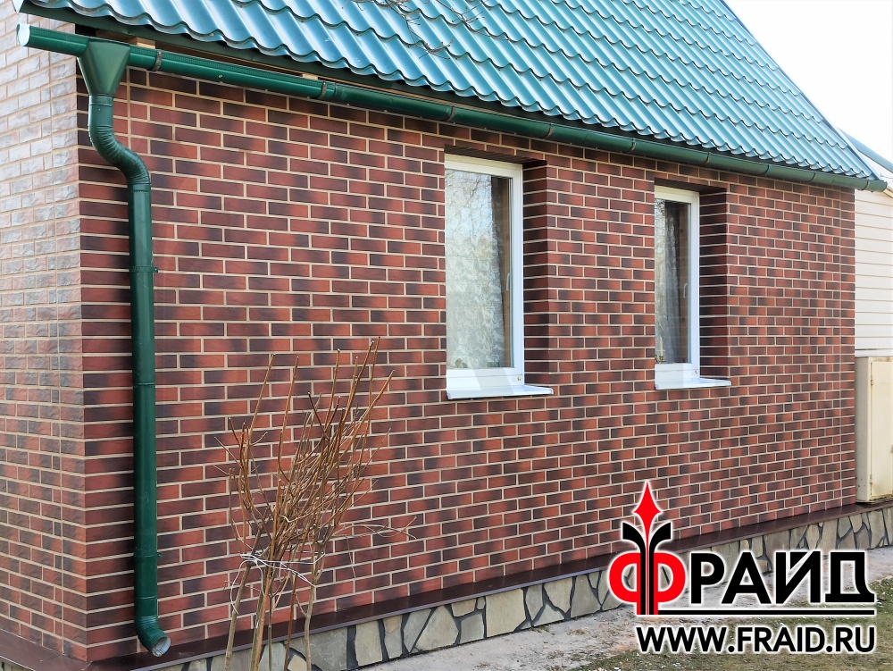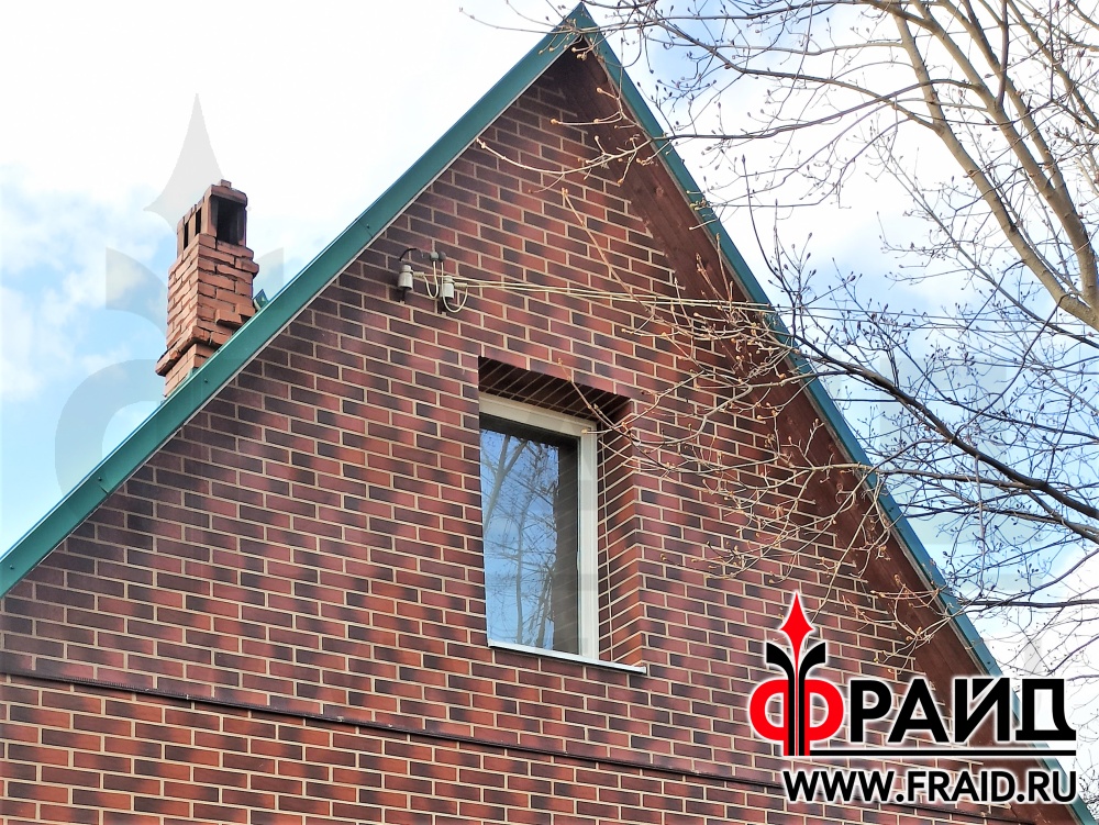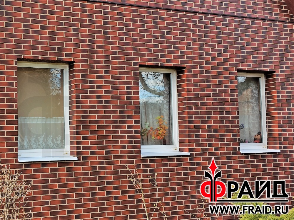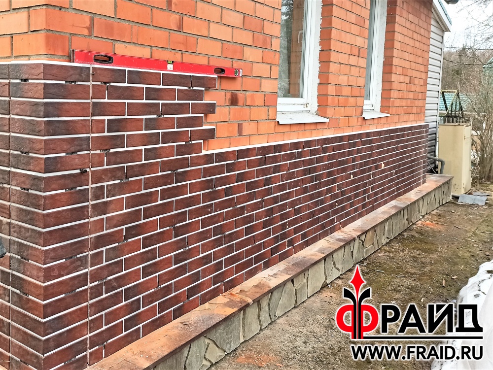 Отделка и утепление кирпичного дома. Термопанели Фрайд Эконом Стандарт с клинкерной плиткой Cerrad Country Wisnia, на цоколе термопанели Фрайд Премиум с натуральным камнем серо зеленый песчаник