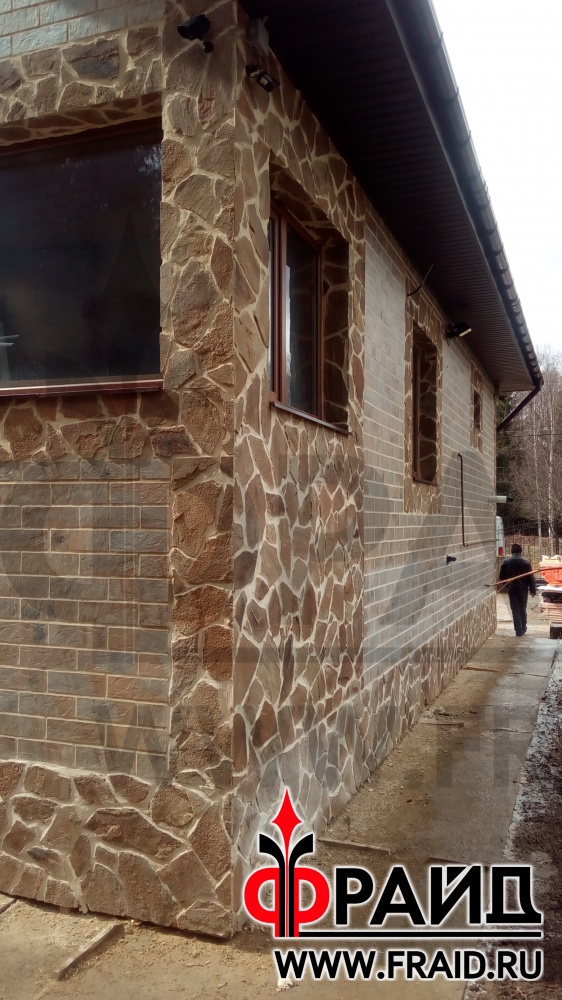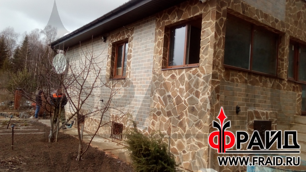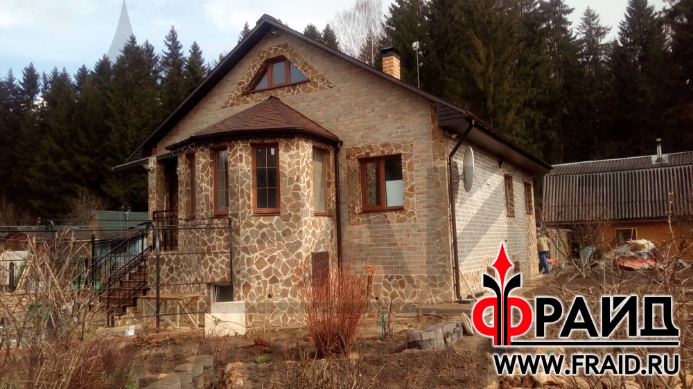 Теплый фасад из термопанелей Фрайд с керамогранитом Kerama Marazzi Сланец  и натуральным камнем Песчаник Дом с отделкой