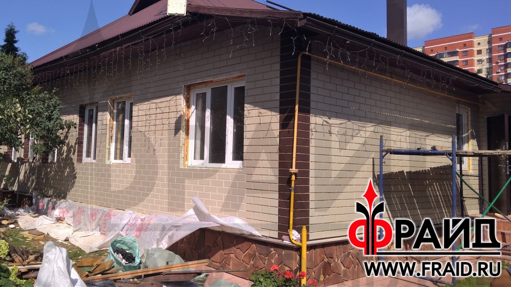 Утепление дома из бруса термопанелями Фрайд с керамогранитом Квадро Декор, отделка фасадным декором Фрайд Декор