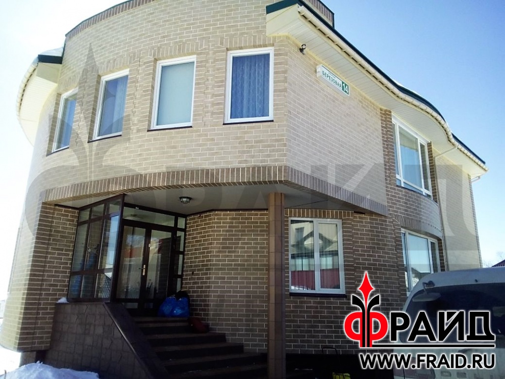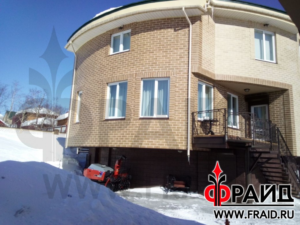 Закругленный фасад отделан термопанелями Фрайд Премиум с керамогранитом Estima AN01, AN03