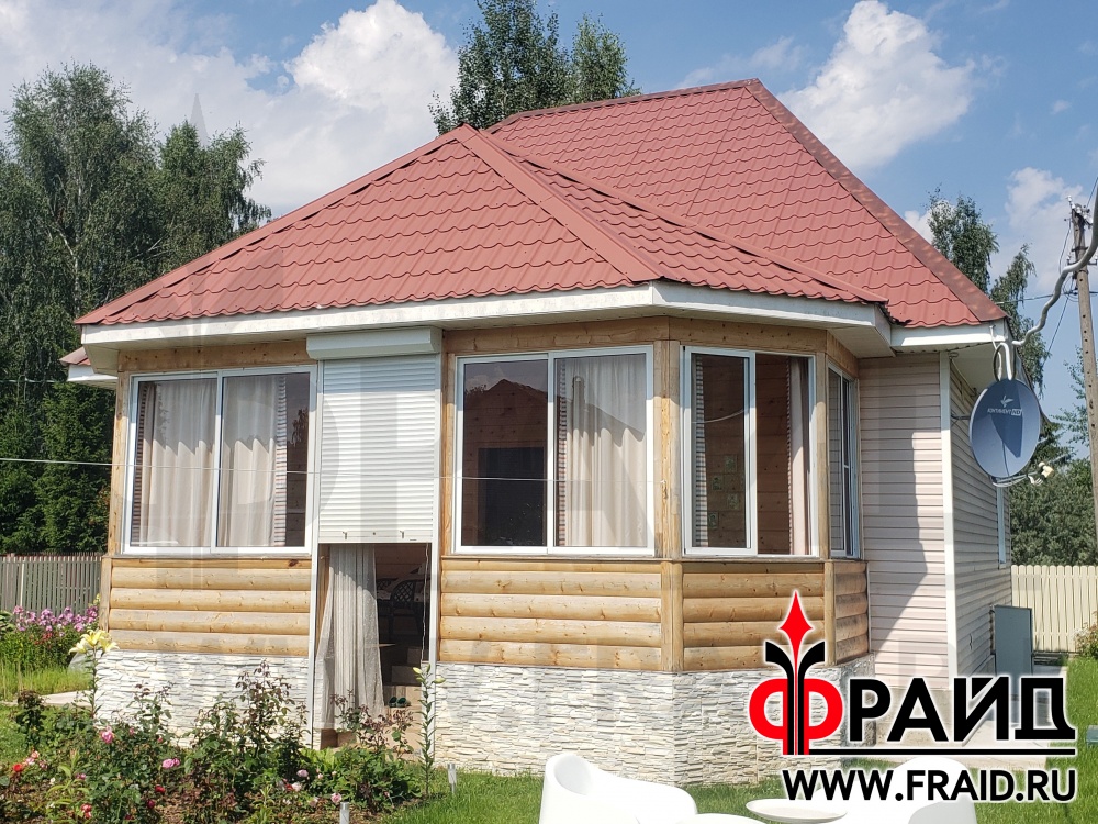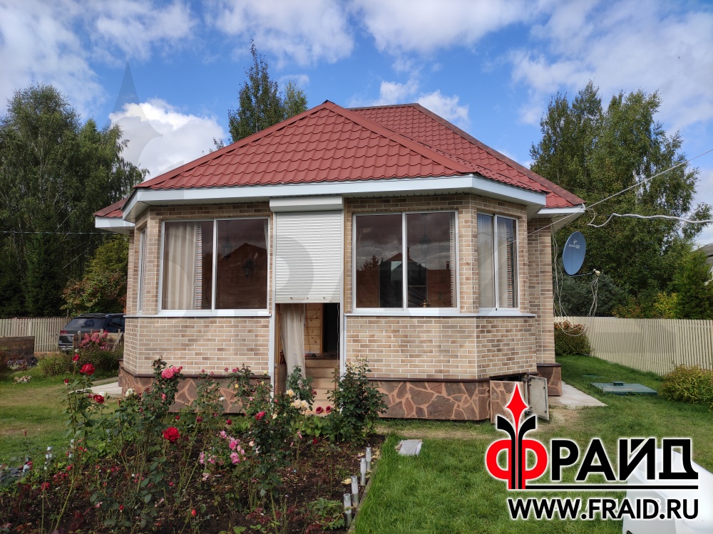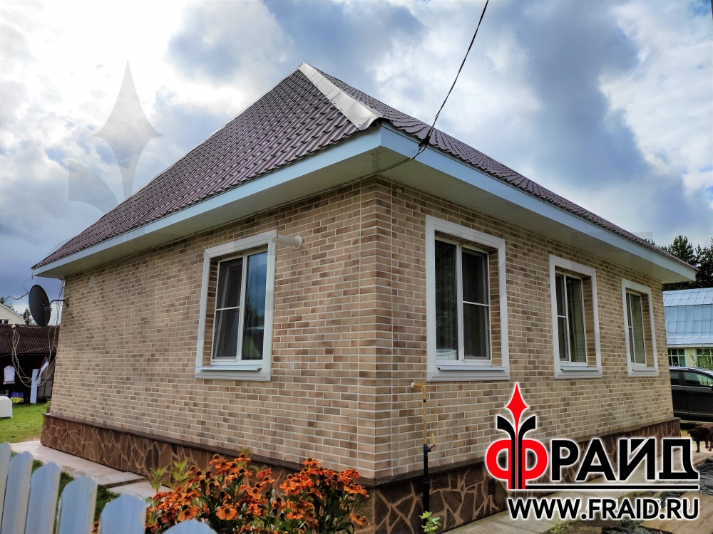 Термопанели Фрайд Премиум с клинкером Cerrad Retro Brick Masala и натуральным песчаником на стенах брусового дома. Использованы элементы фасадного декора Фрайд.