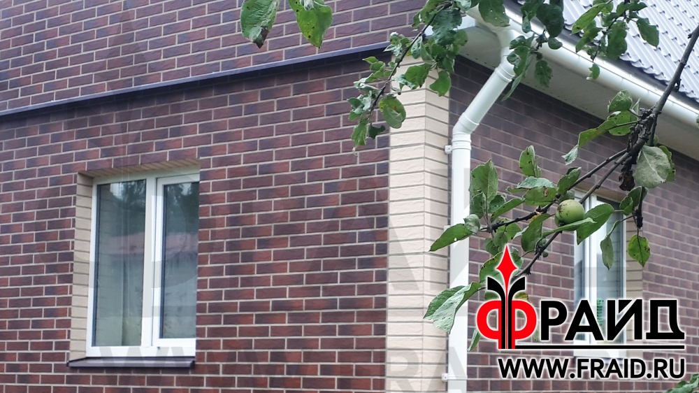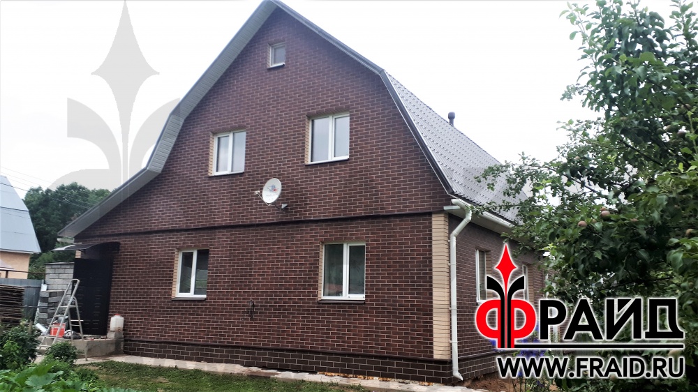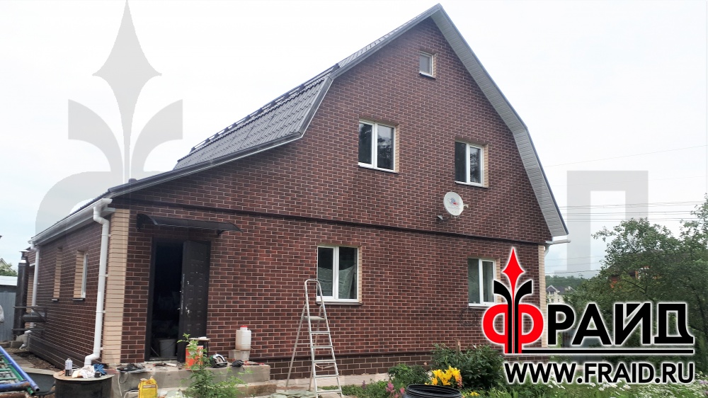 Термопанели Фрайд Премиум с клинкерной плиткой Cerrad Rustico Country Wisnia и Rustico Krem, а также Керамин Амстердам на цоколь. Реконструкция фасада. Первый этаж оштукатуренный пеноблок, второй этаж каркас.
