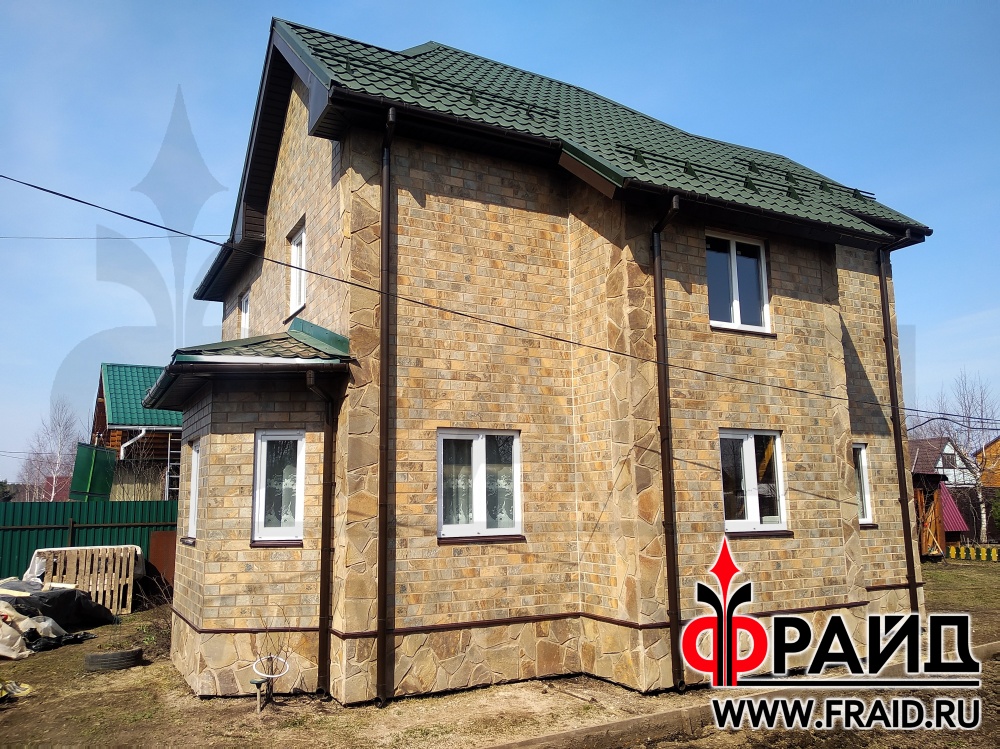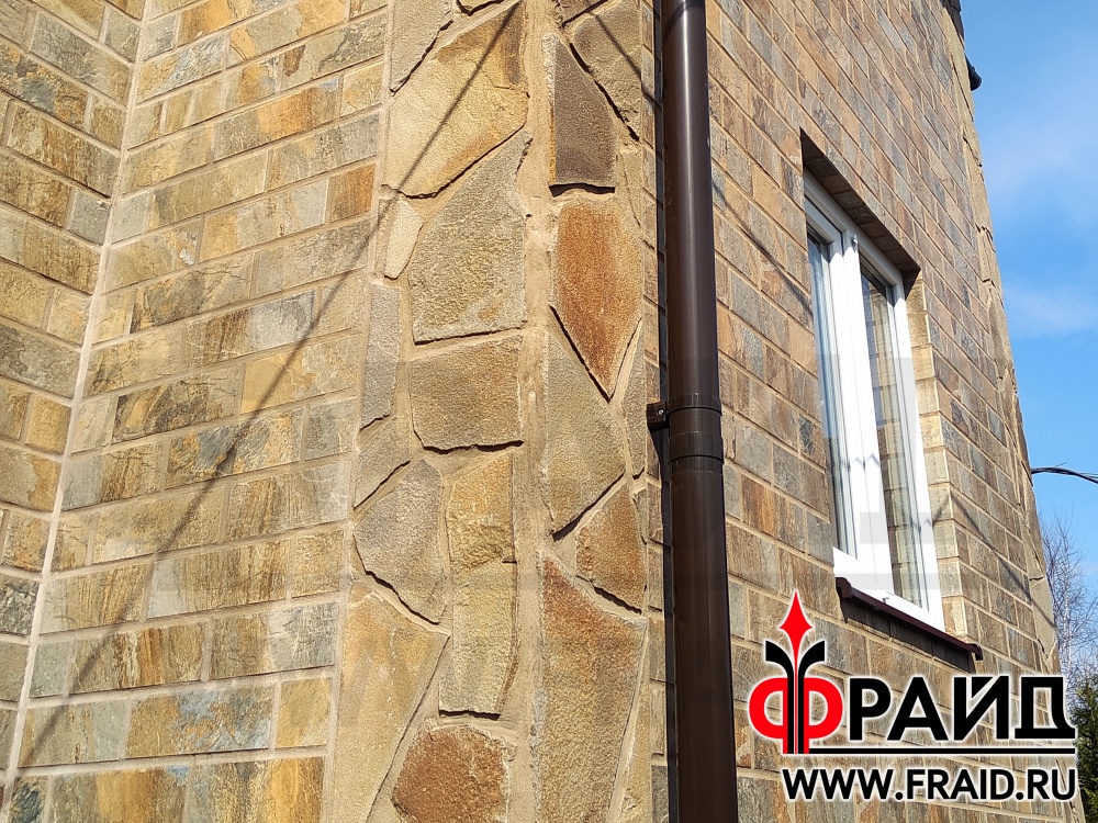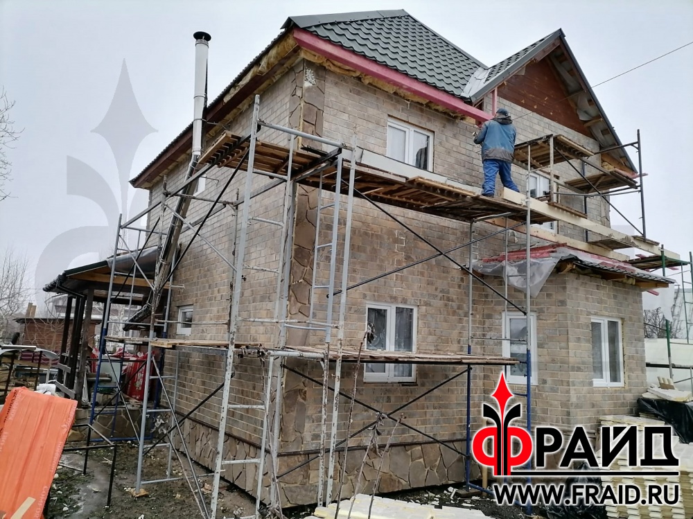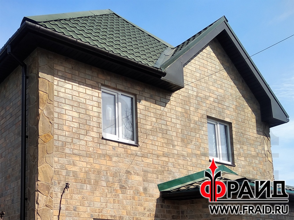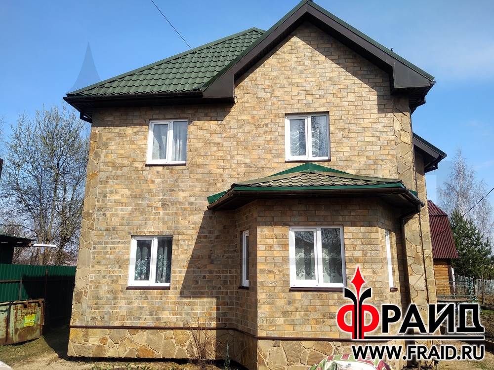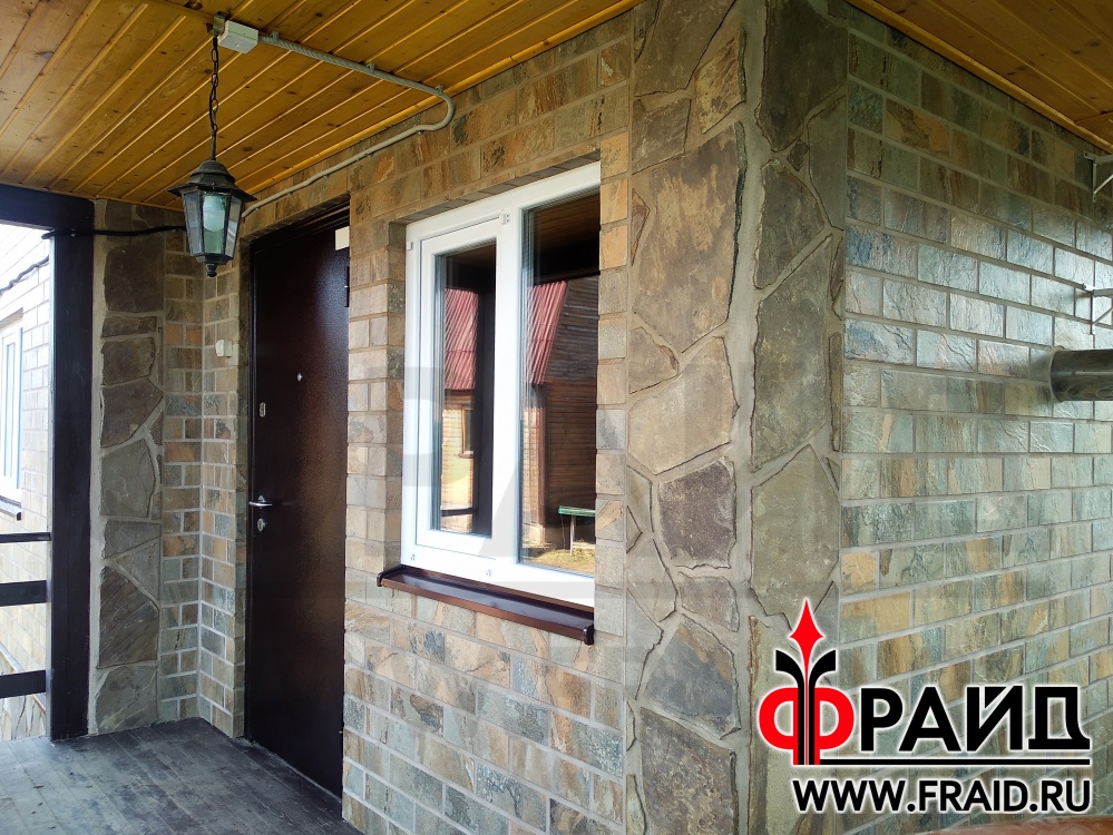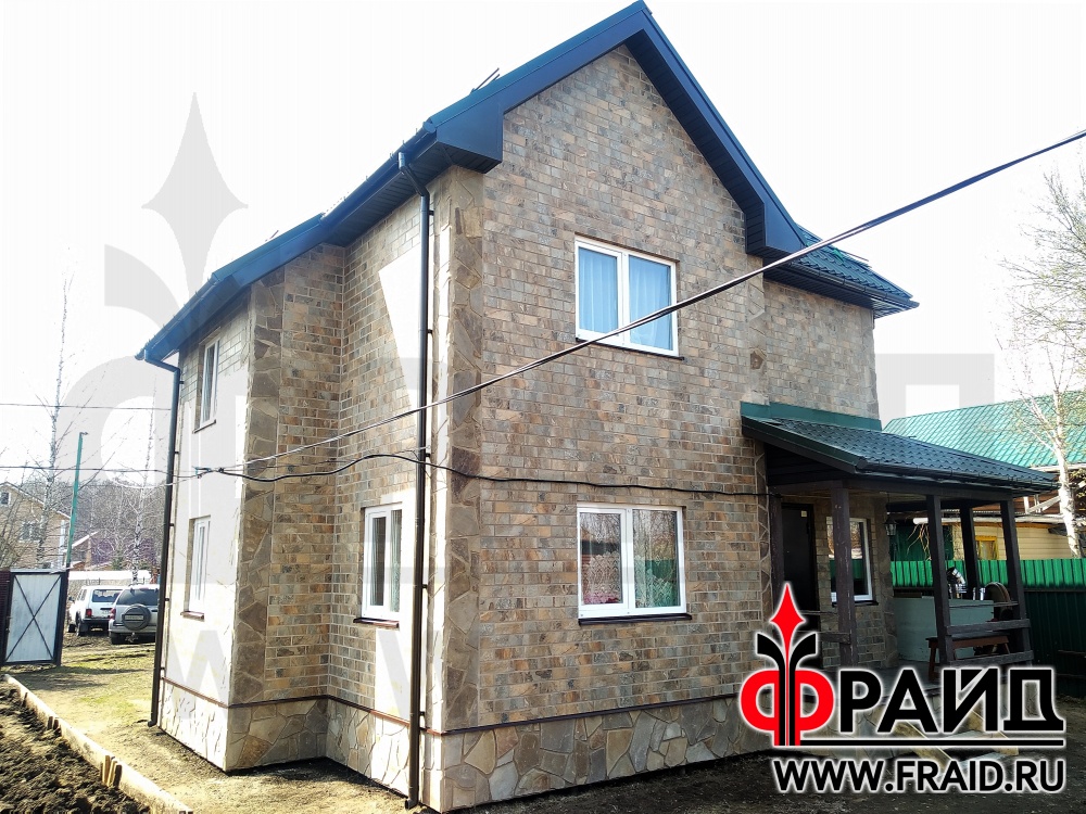 Дом из бруса. Отделка и утепление фасада. Термопанели Фрайд Премиум с керамогранитом Kerama Marazzi Сланец бежевый и с натуральным камнем - ростовский песчаник желтосерый.