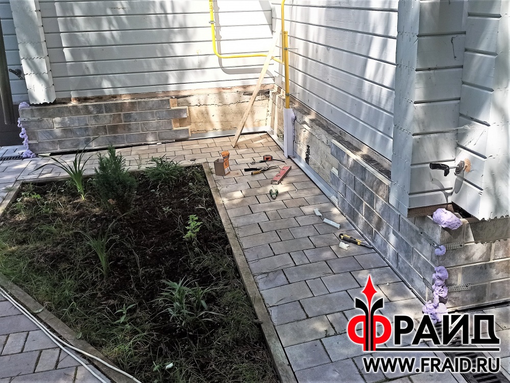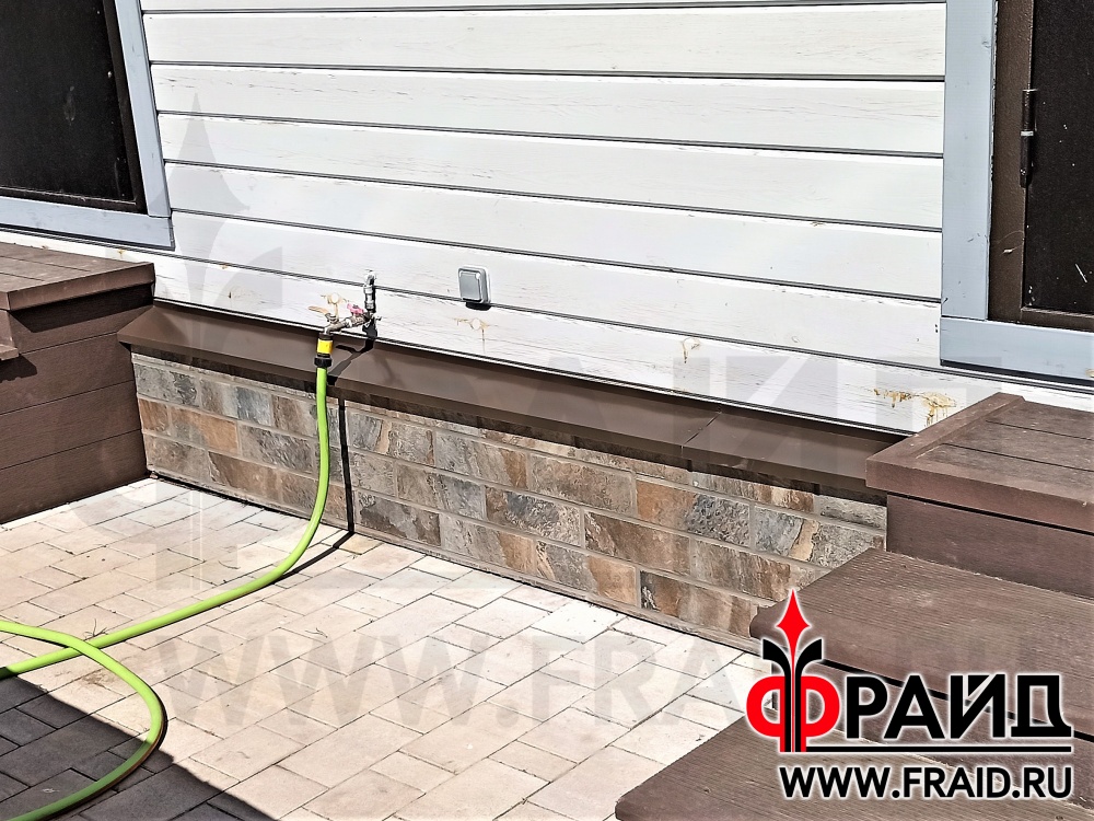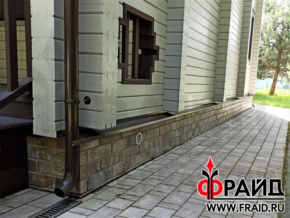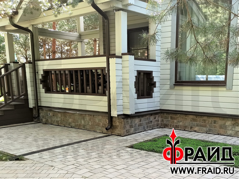Бетонный цоколь деревянного дома из бруса. Термопанели Фрайд Премиум с керамогранитом Kerama Marazzi Сланец темный.