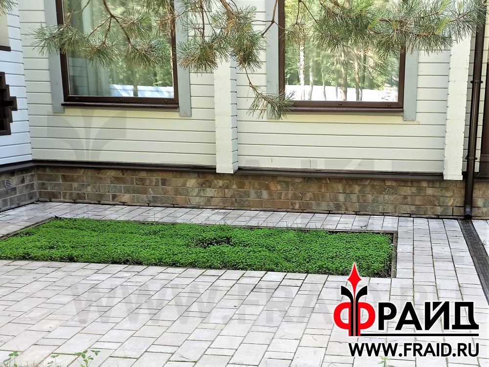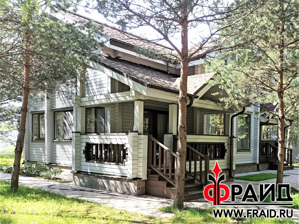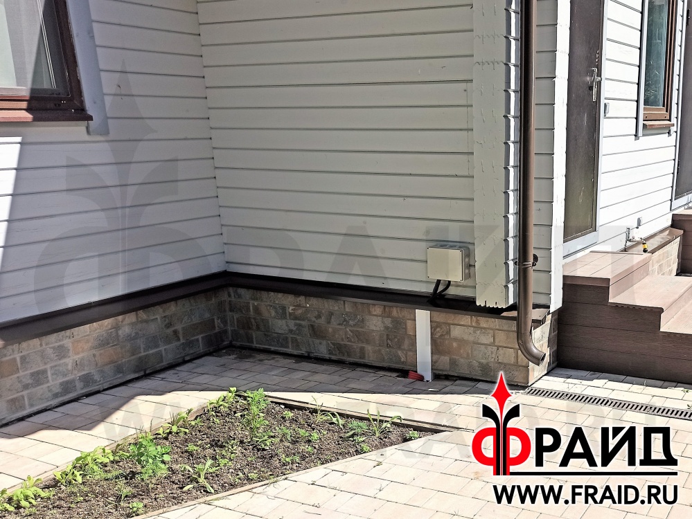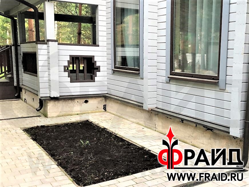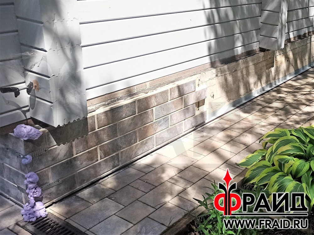 Бетонный цоколь деревянного дома из бруса. Термопанели Фрайд Премиум с керамогранитом Kerama Marazzi Сланец темный.
