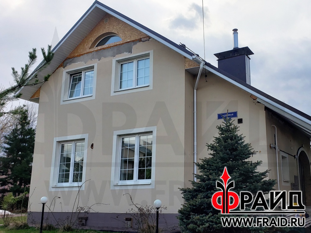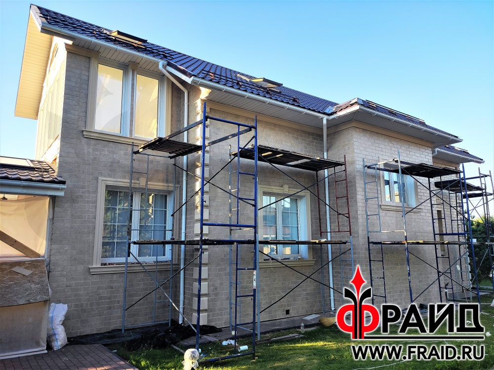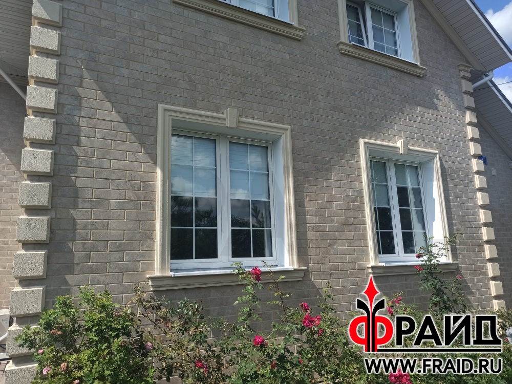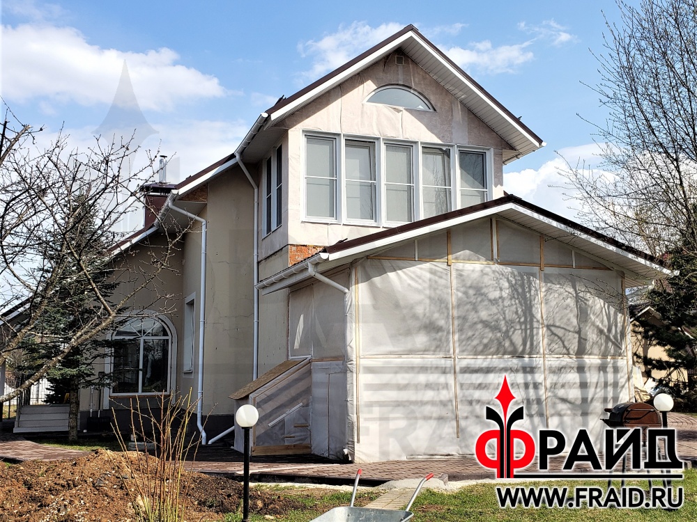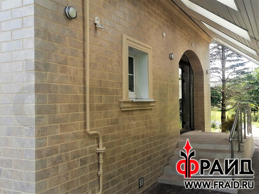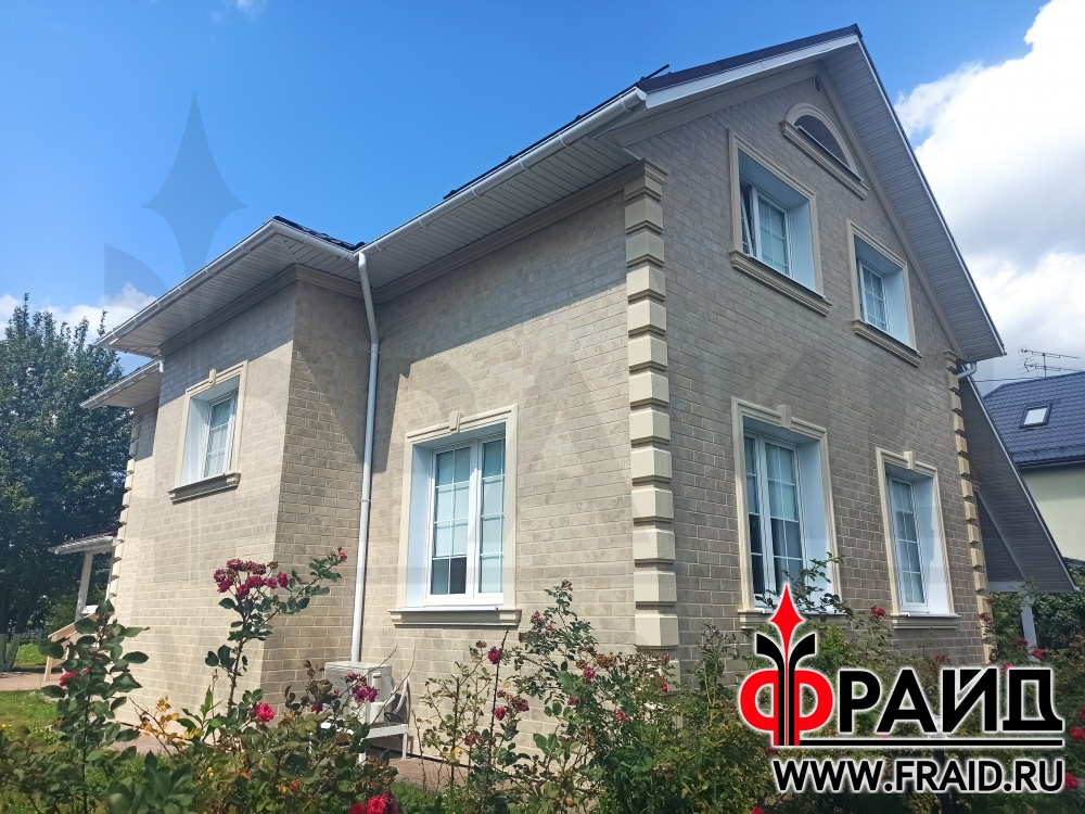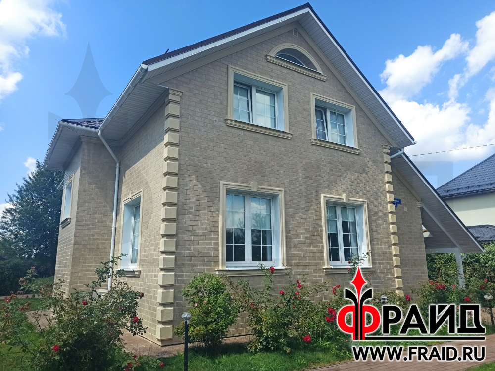 Оштукатуренный дом из керамических блоков с каркасной пристройкой. На стенах термопанели Фрайд Премиум с керамогранитом Kerama Marazzi Песчаник бежевый и фасадный декор Фрайд Декор.