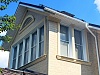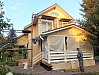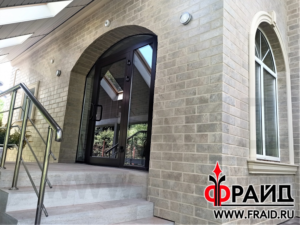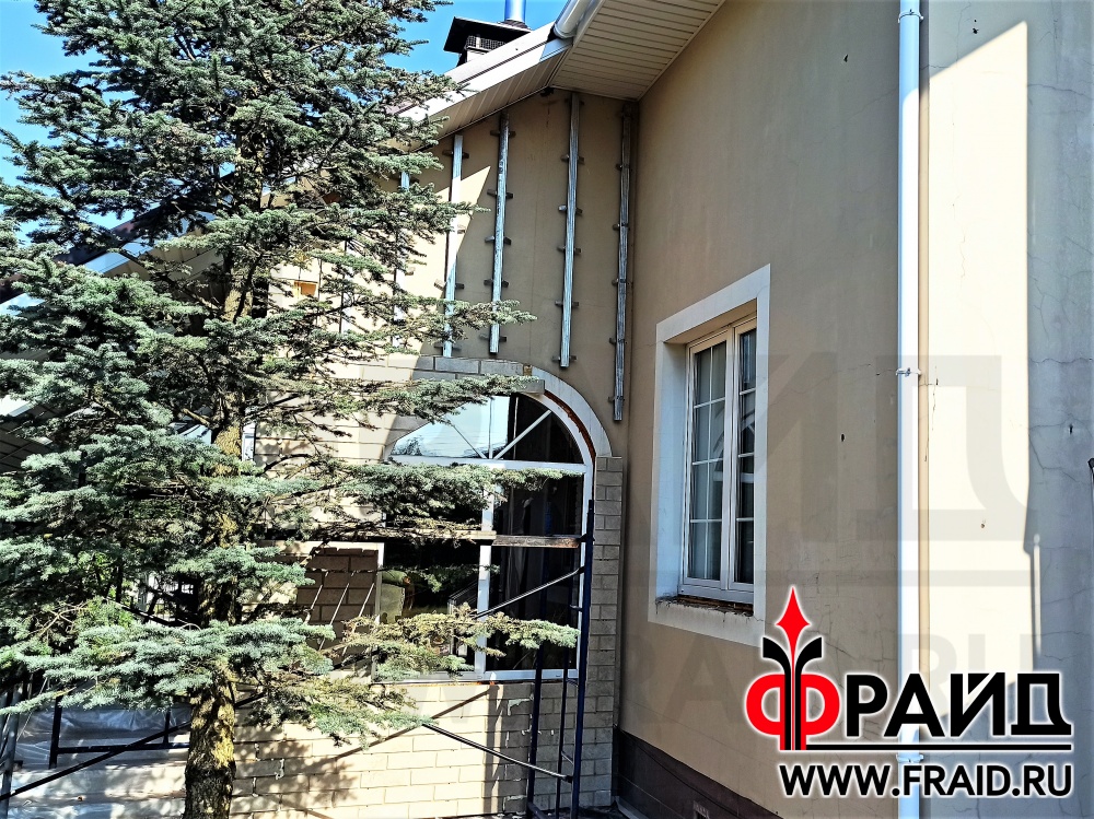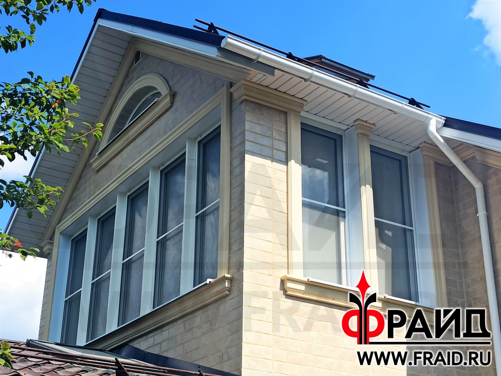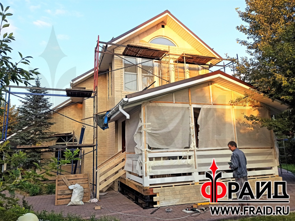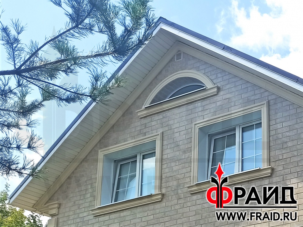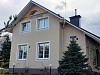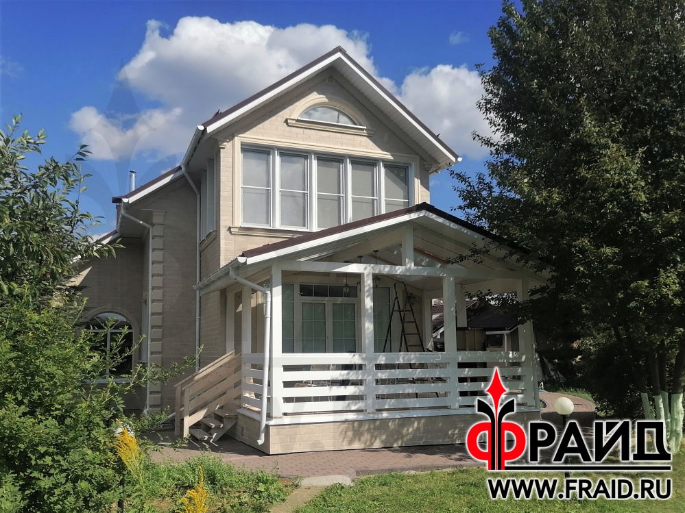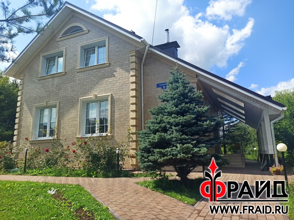 Оштукатуренный дом из керамических блоков с каркасной пристройкой. На стенах термопанели Фрайд Премиум с керамогранитом Kerama Marazzi Песчаник бежевый и фасадный декор Фрайд Декор.