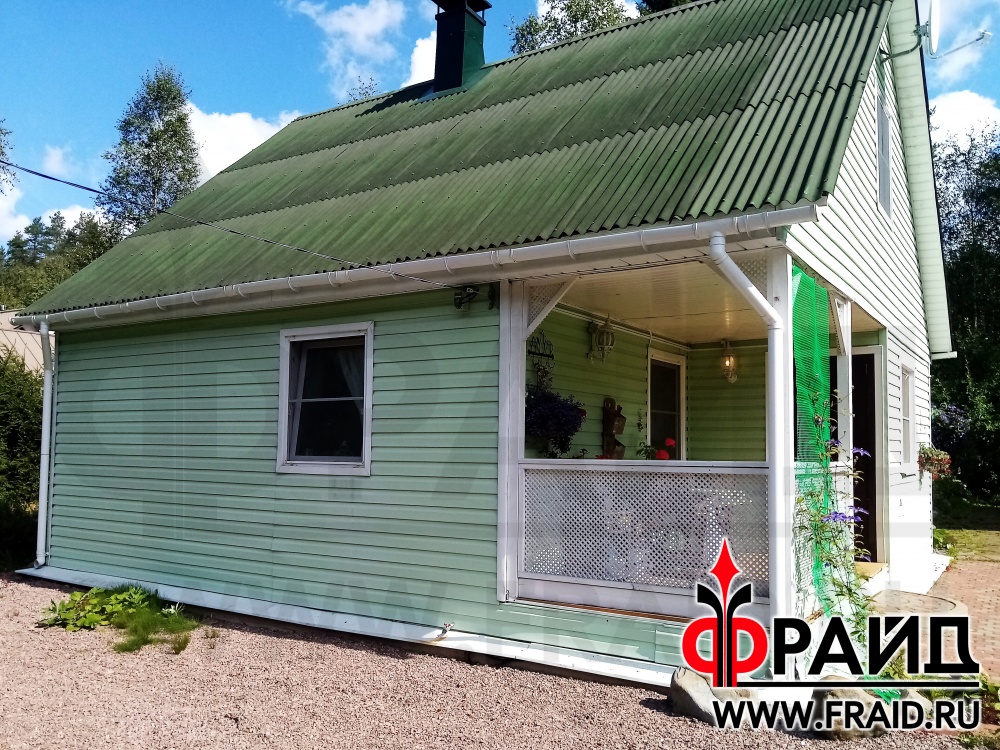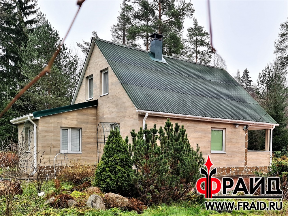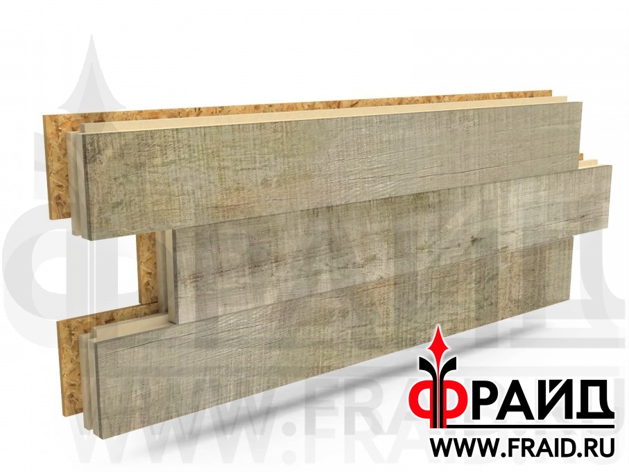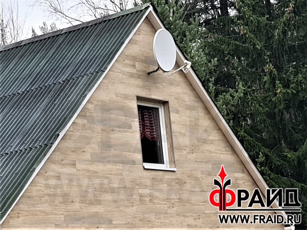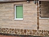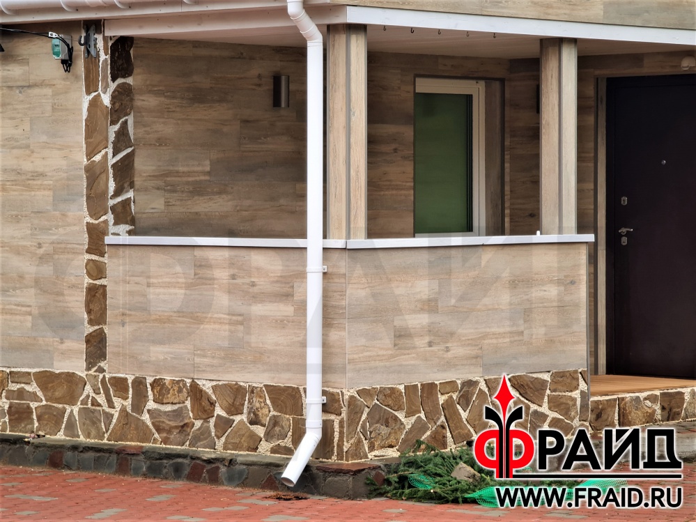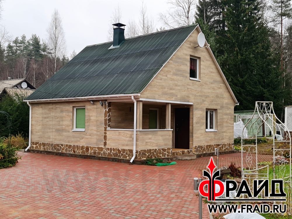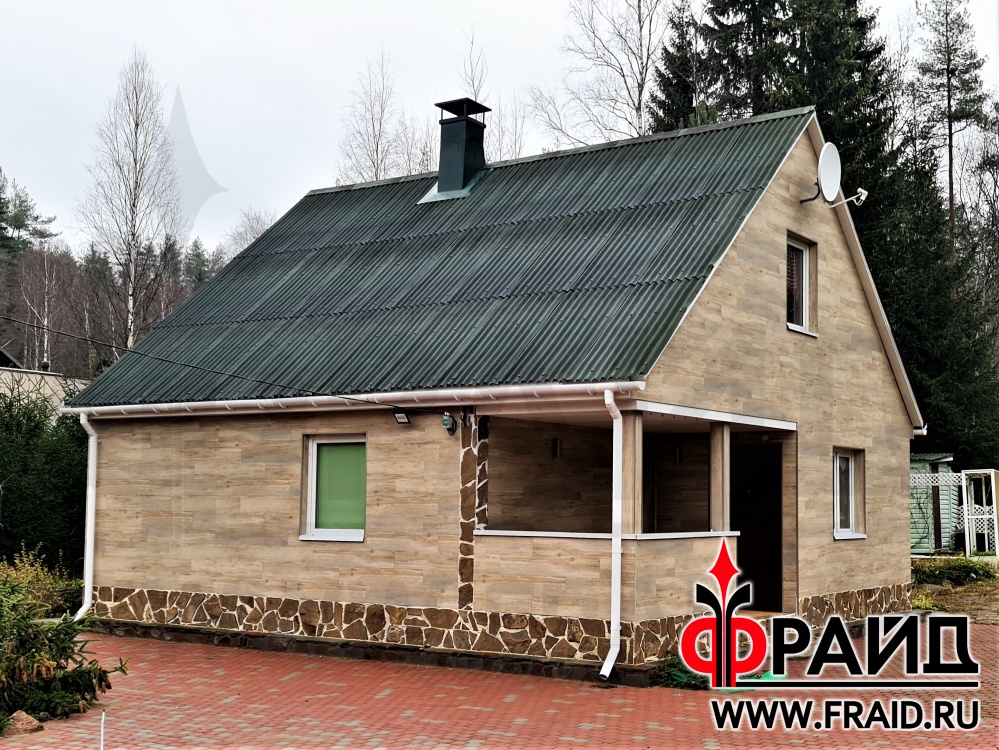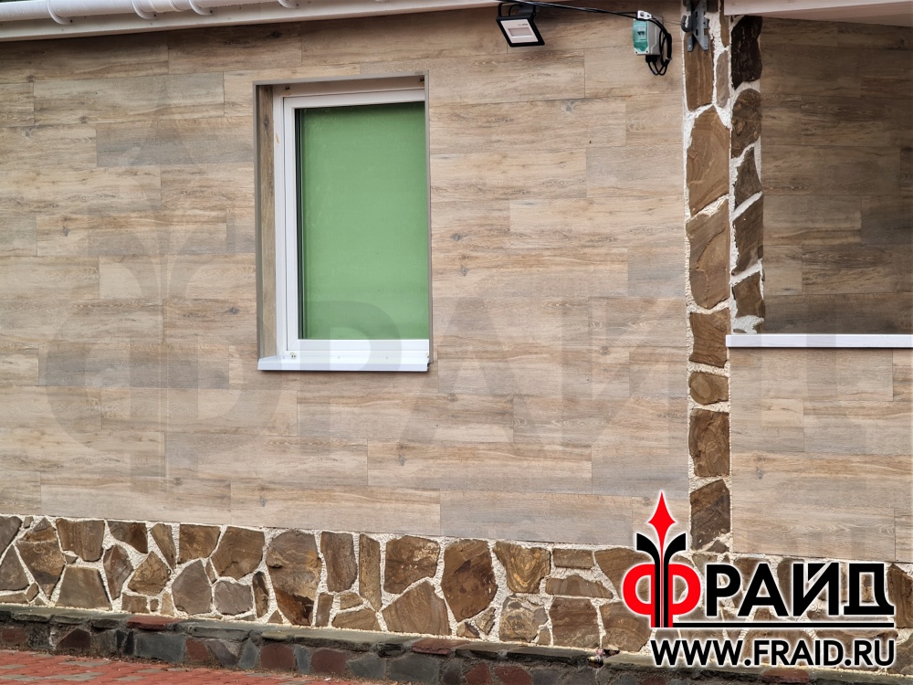 Термопанели Фрайд Премиум с керамогранитом под дерево Estima BG02 и с натуральным камнем ростовский песчаник серо-желтый на цоколь . Дом брус и каркас.