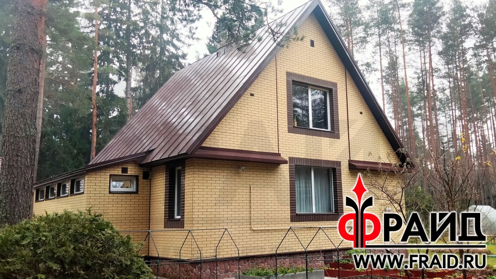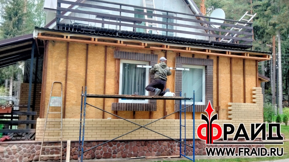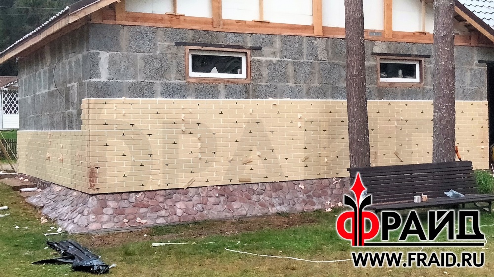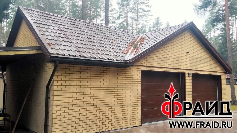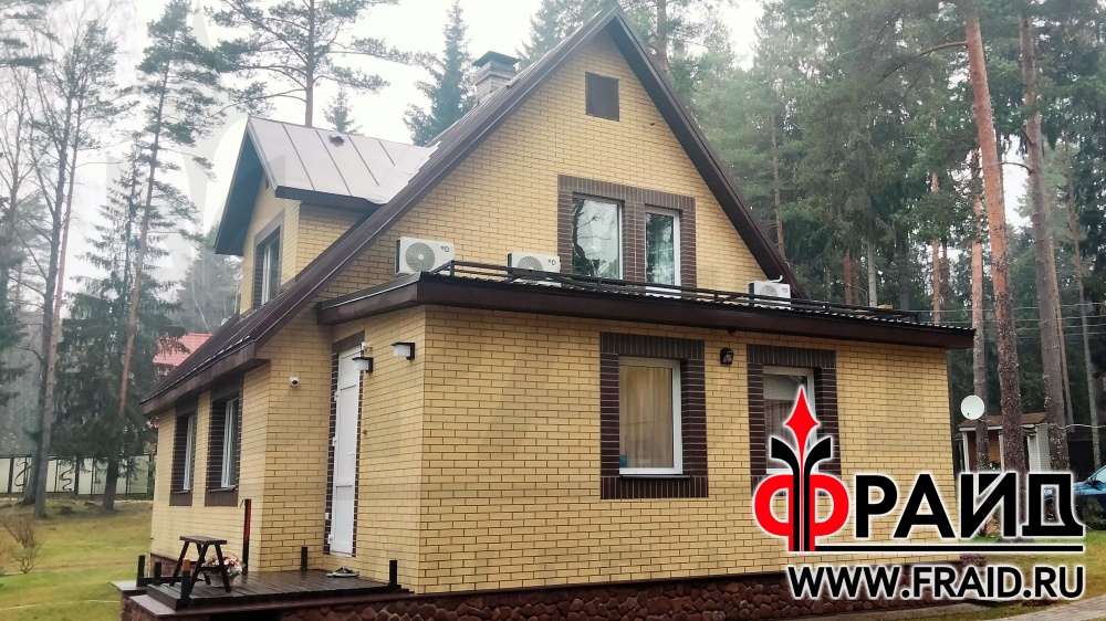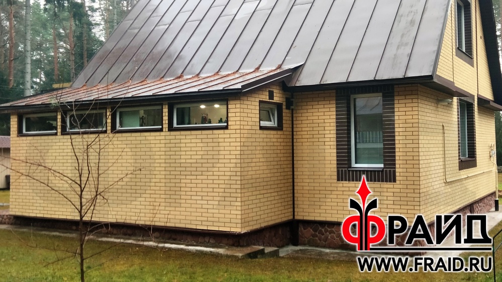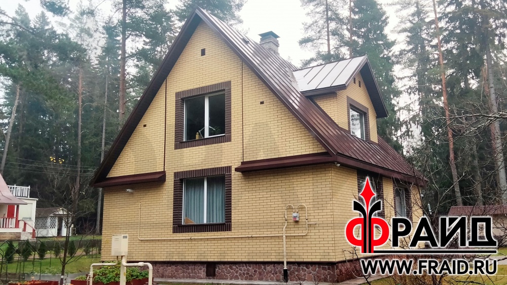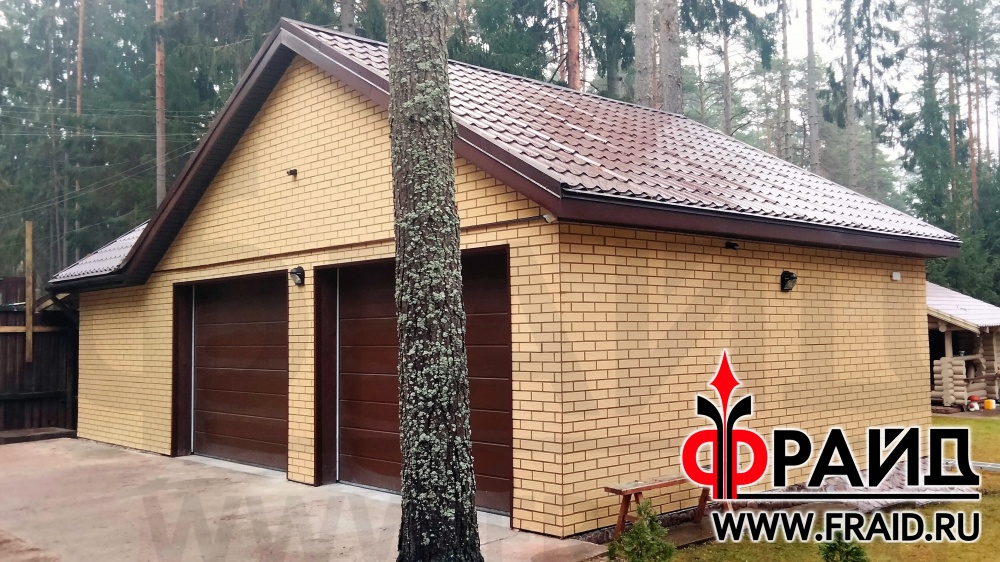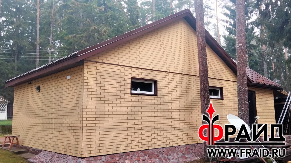 Отделка каркасного дома - термопанели Фрайд Премиум. Утепление гаража из керамзитобетонных блоков - термопанели Фрайд Эконом Стандарт. Клинкерная плитка Cerrad Rustico Piaskowa, Paradyz Natural Brown Duro.