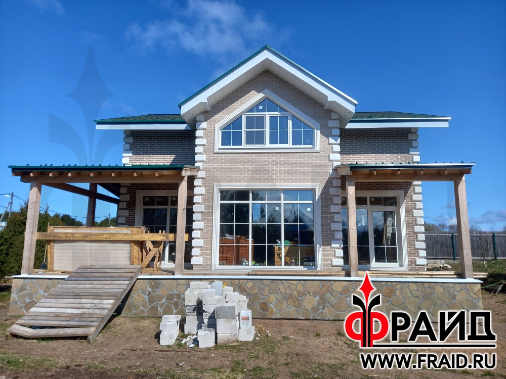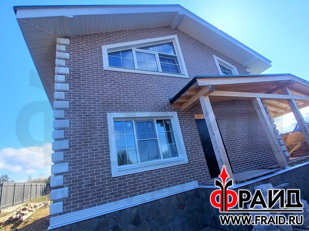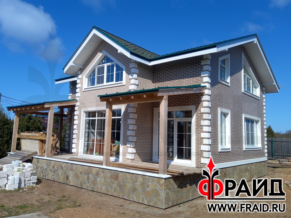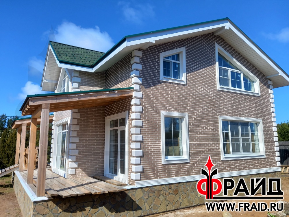 Термопанели Фрайд Премиум с клинкерной плиткой Paradyz mattone sabia brown и beige, на цоколе с натуральным камнем - серозеленый песчаник. На окнах и углах Фрайд Декор. Дом - газосиликатные блоки.