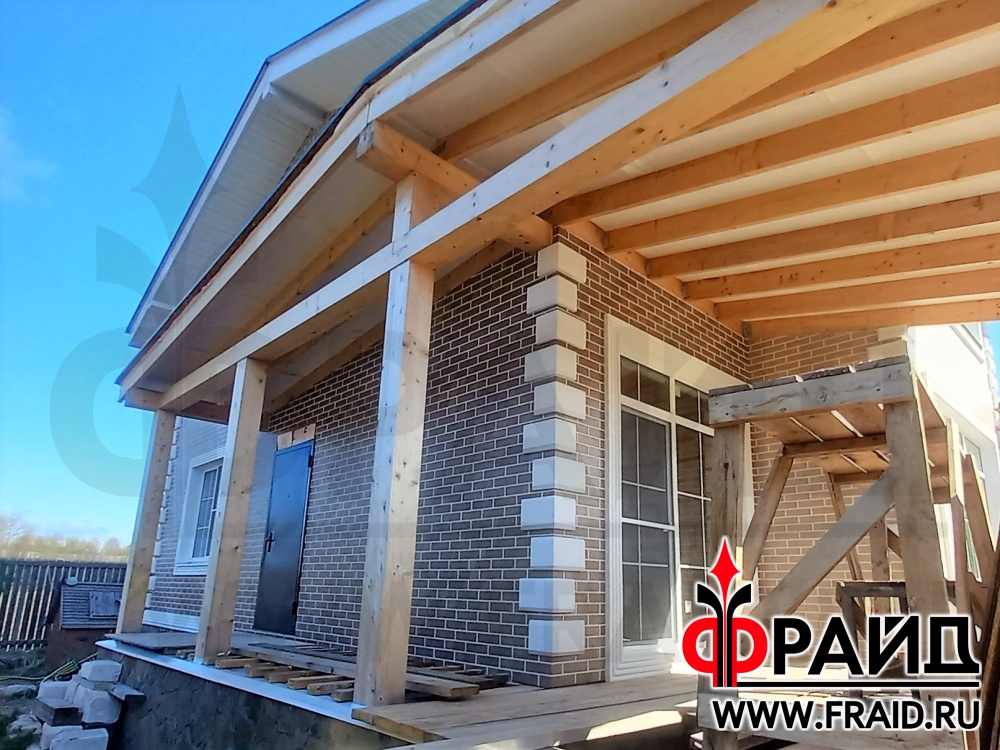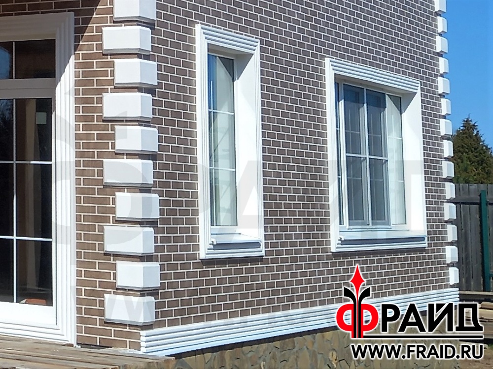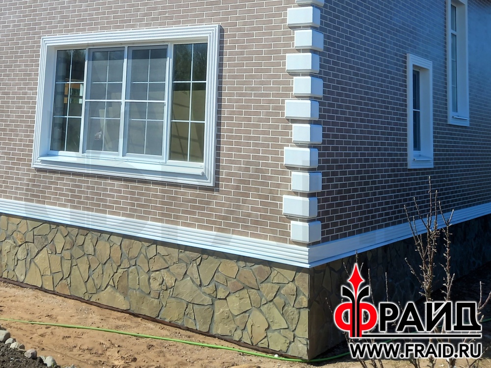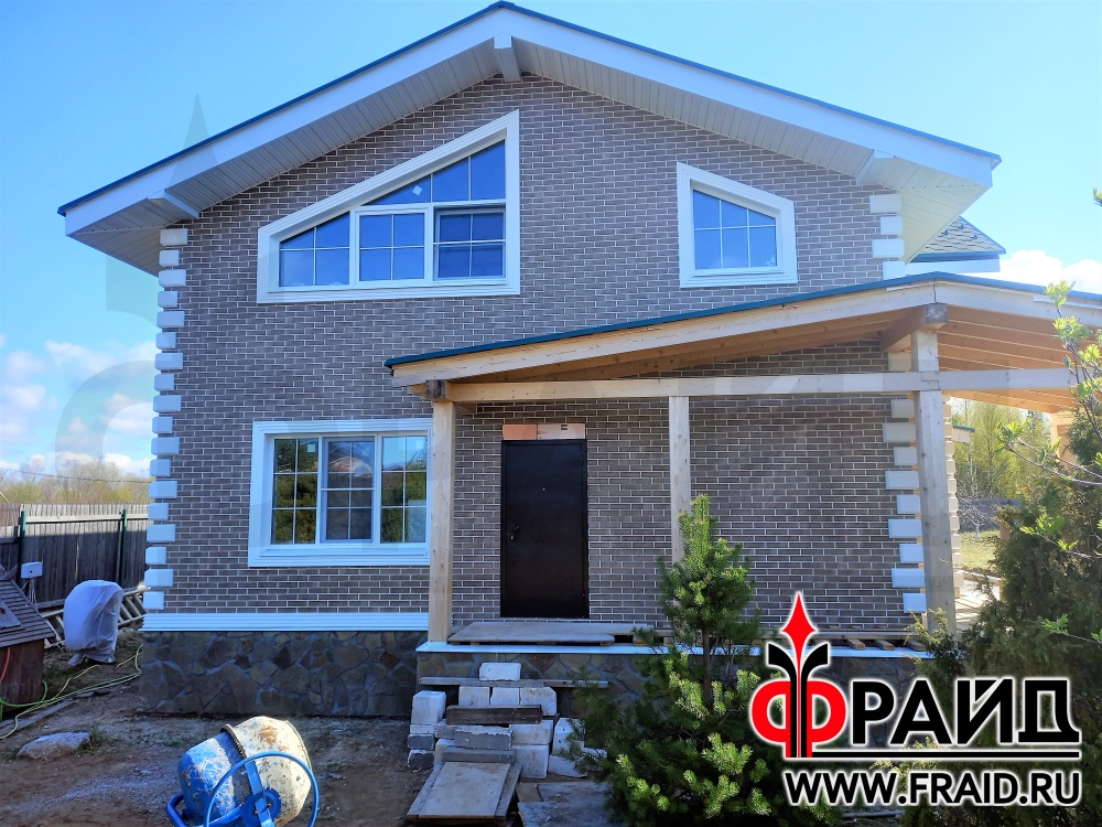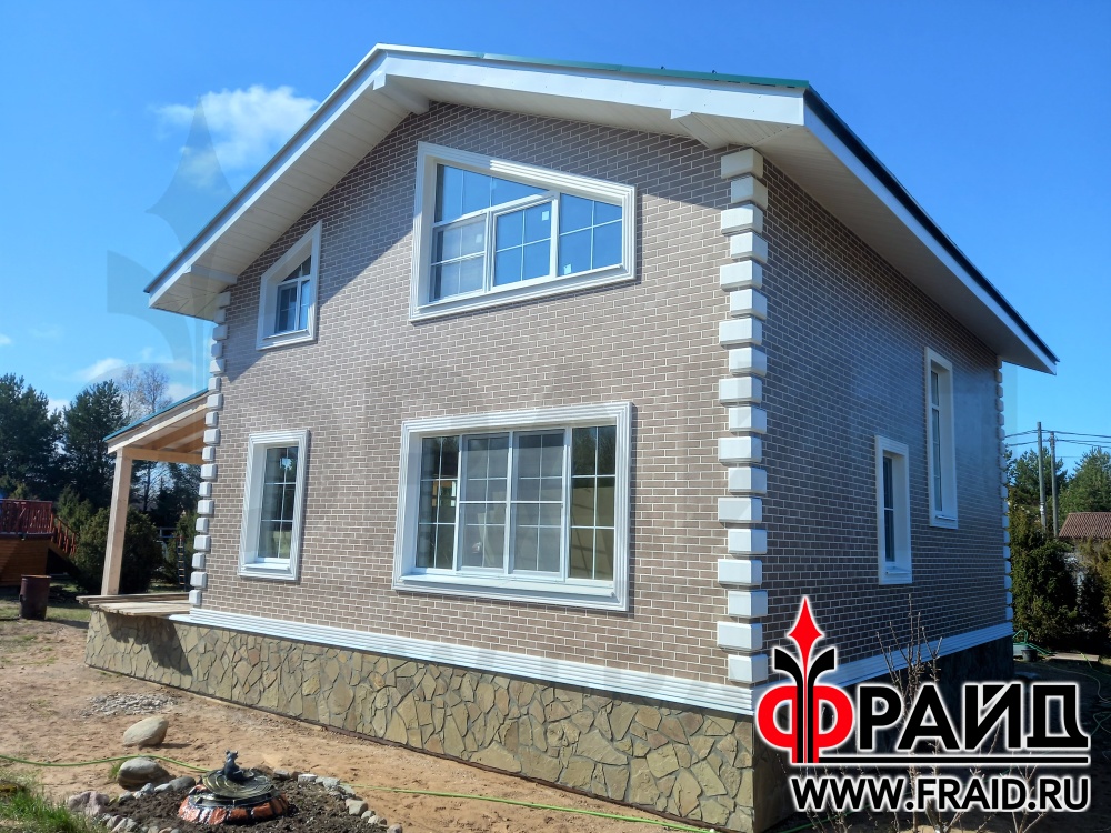 Термопанели Фрайд Премиум с клинкерной плиткой Paradyz mattone sabia brown и beige, на цоколе с натуральным камнем - серозеленый песчаник. На окнах и углах Фрайд Декор. Дом - газосиликатные блоки.