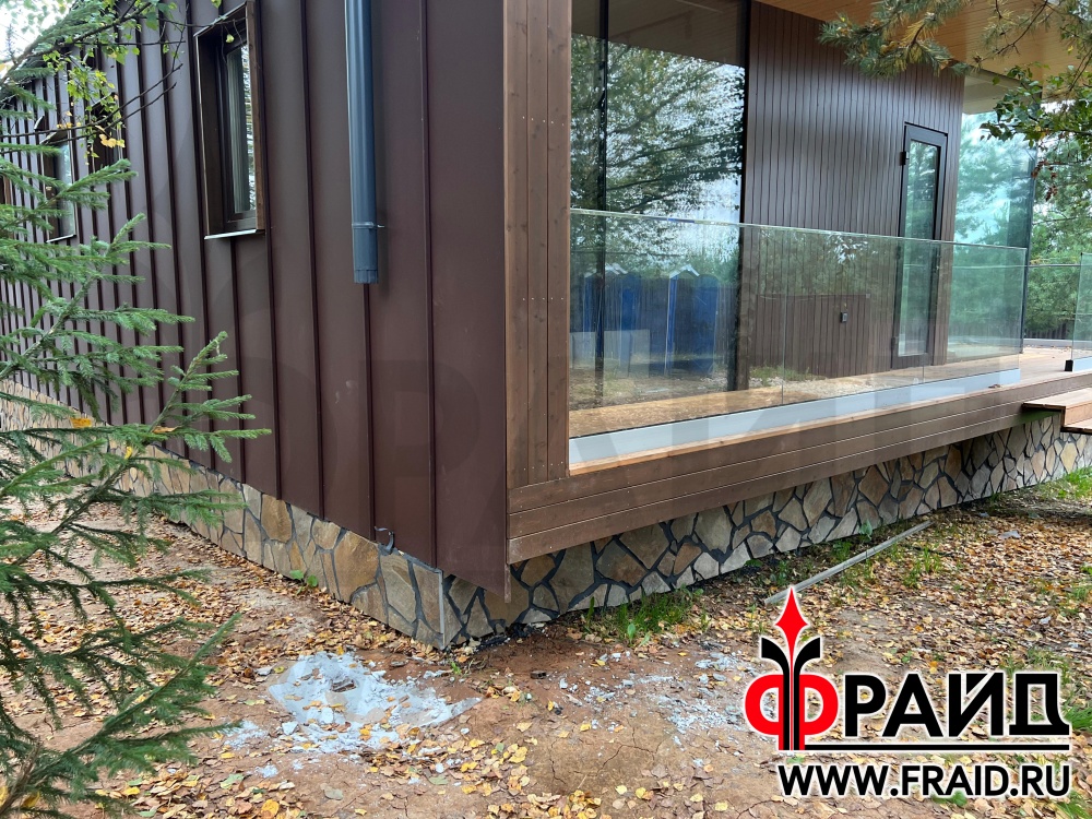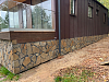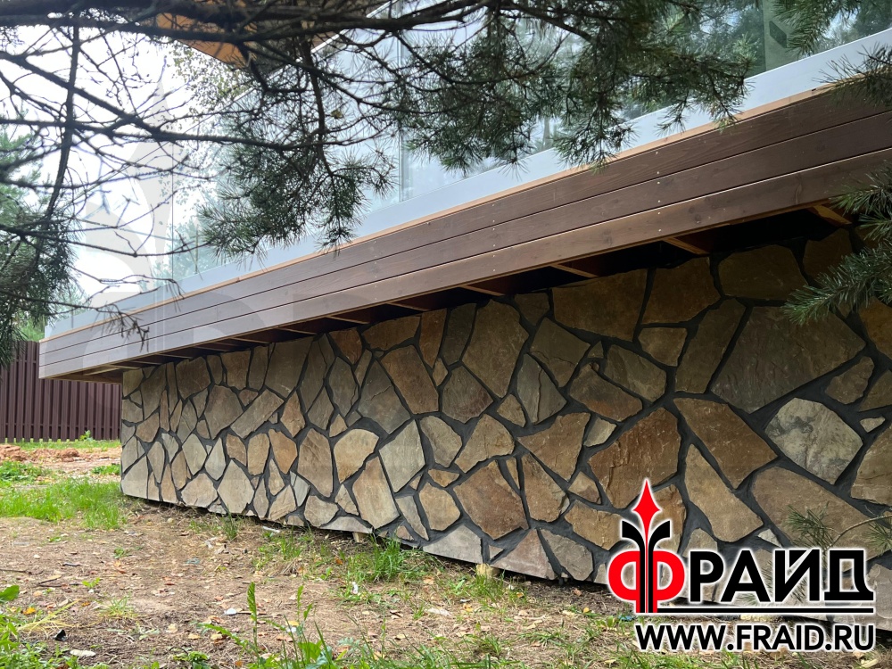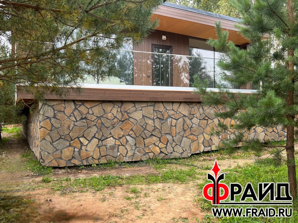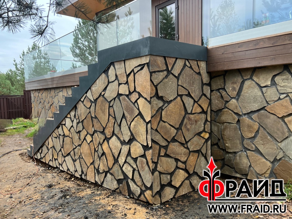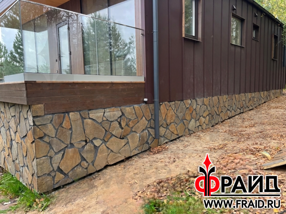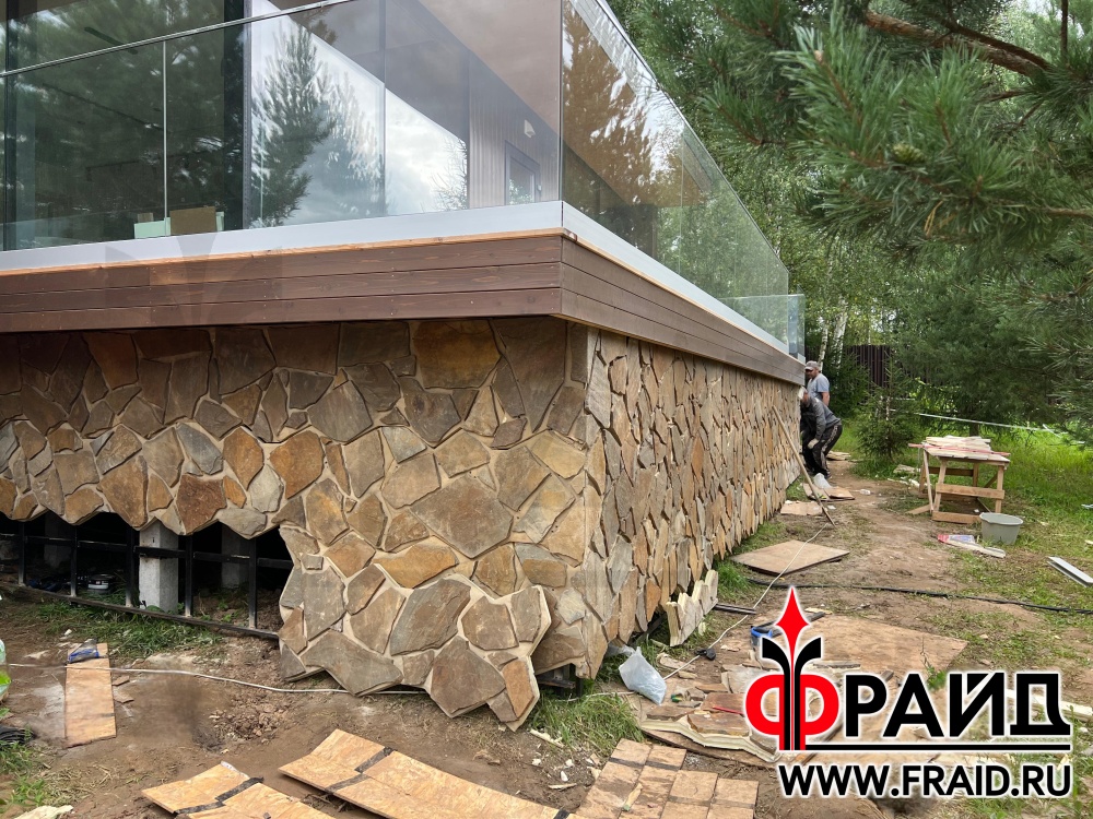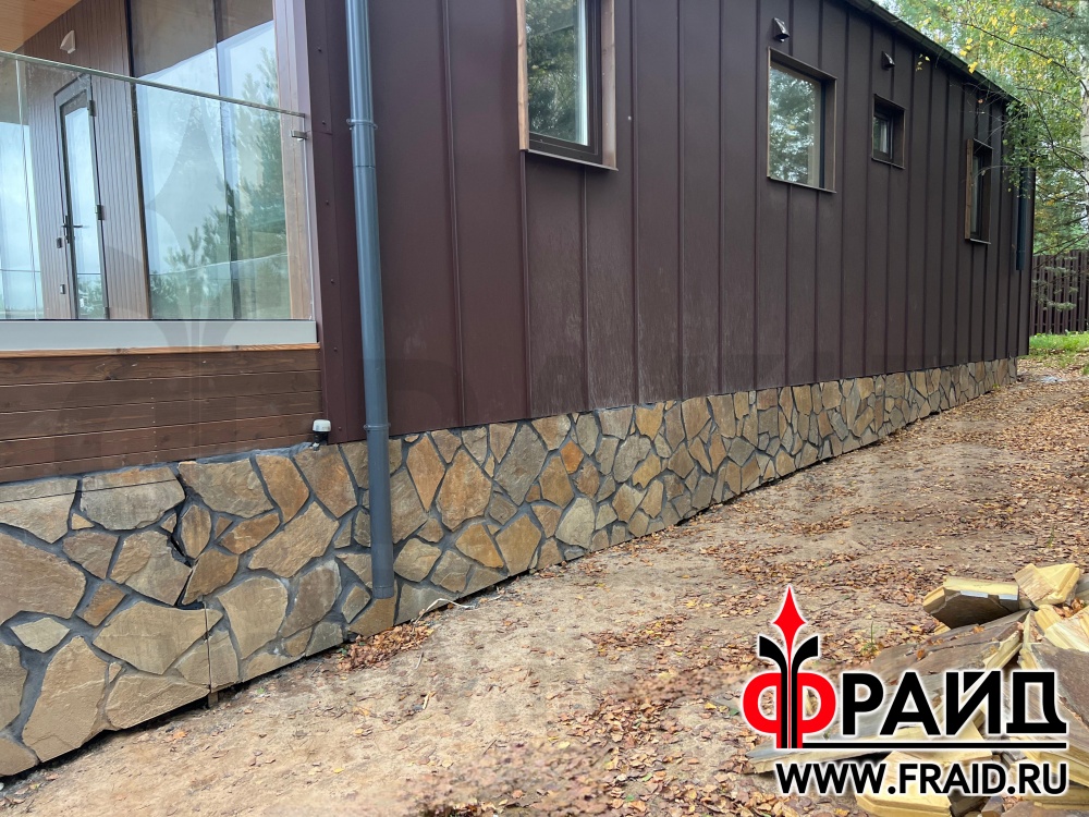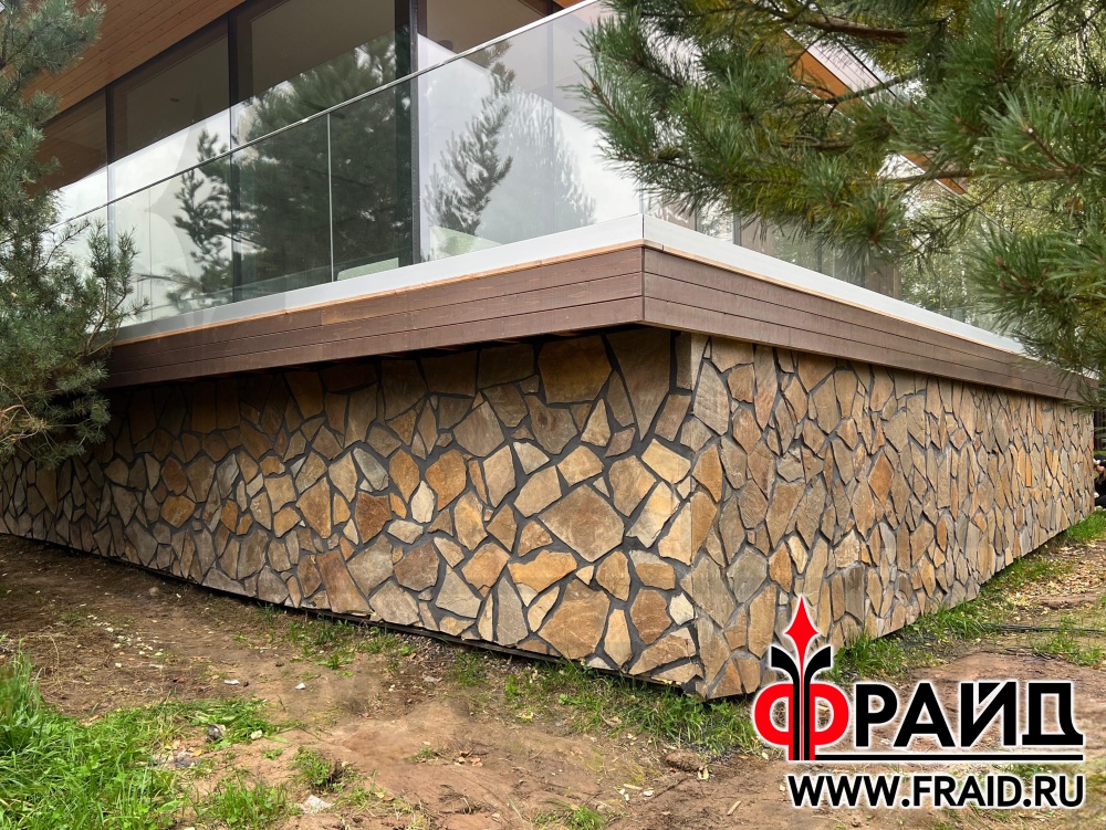 Отделка цоколя дома на бетонных сваях. Термопанели Фрайд Премиум с ростовским желто серым песчаником.