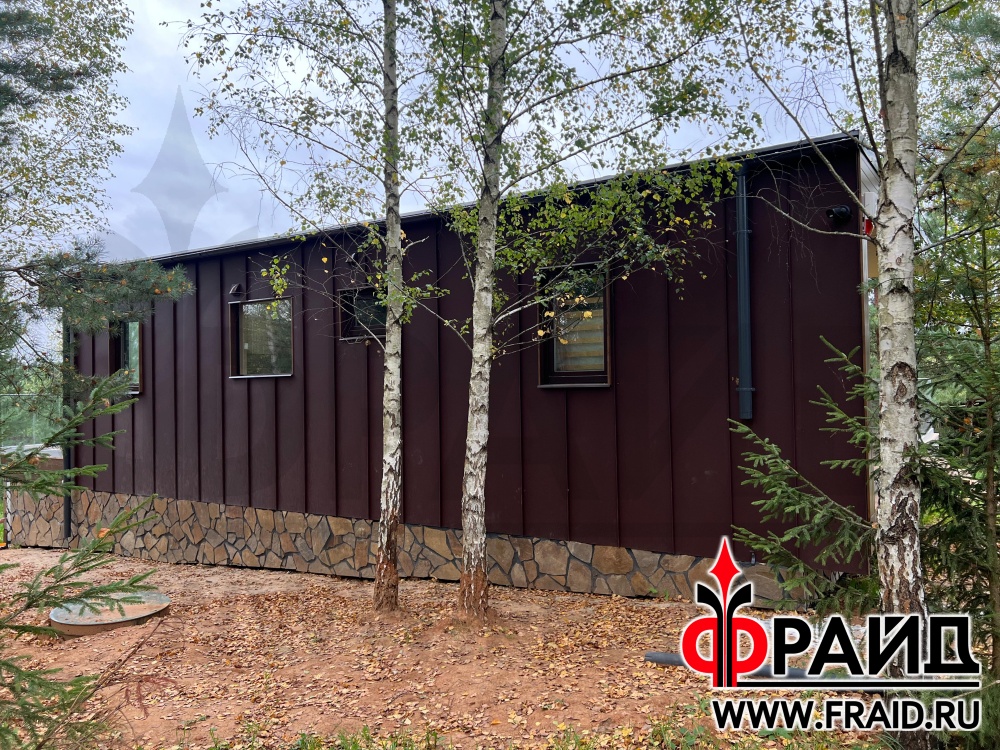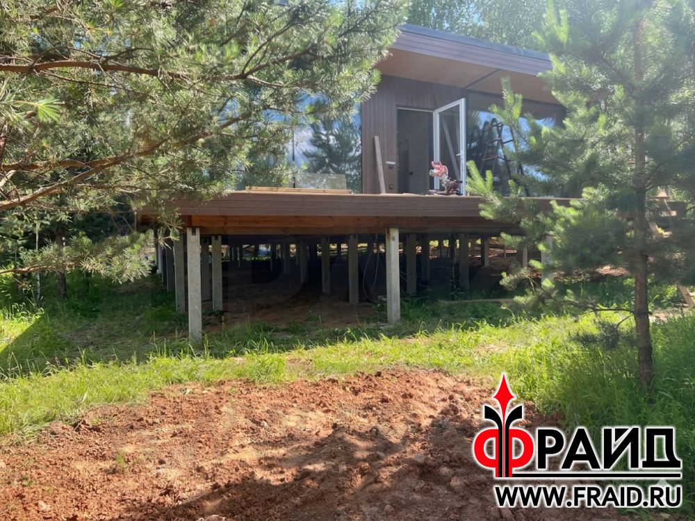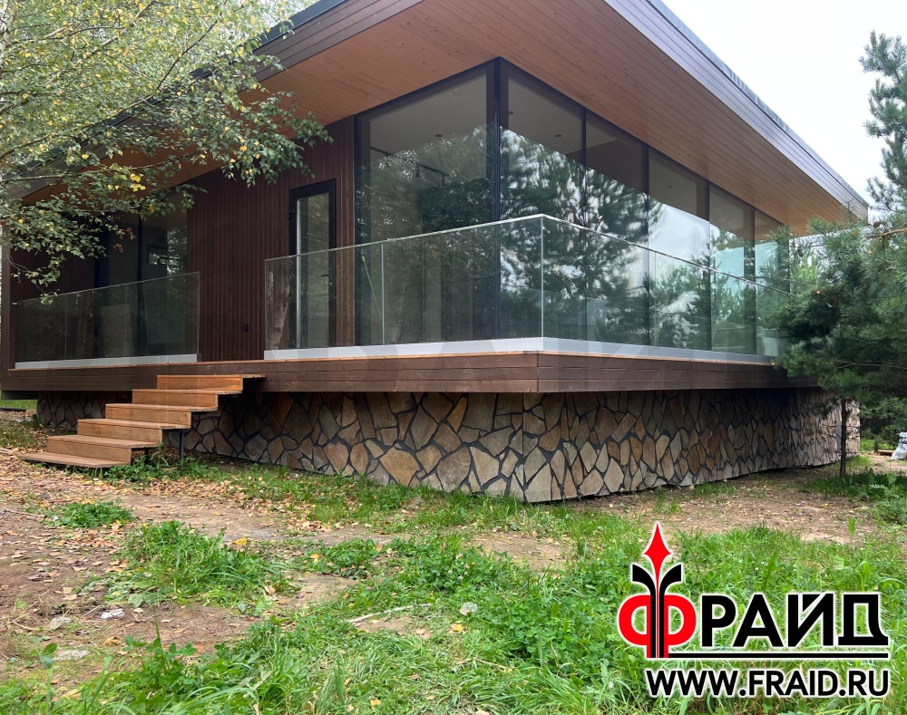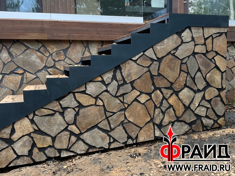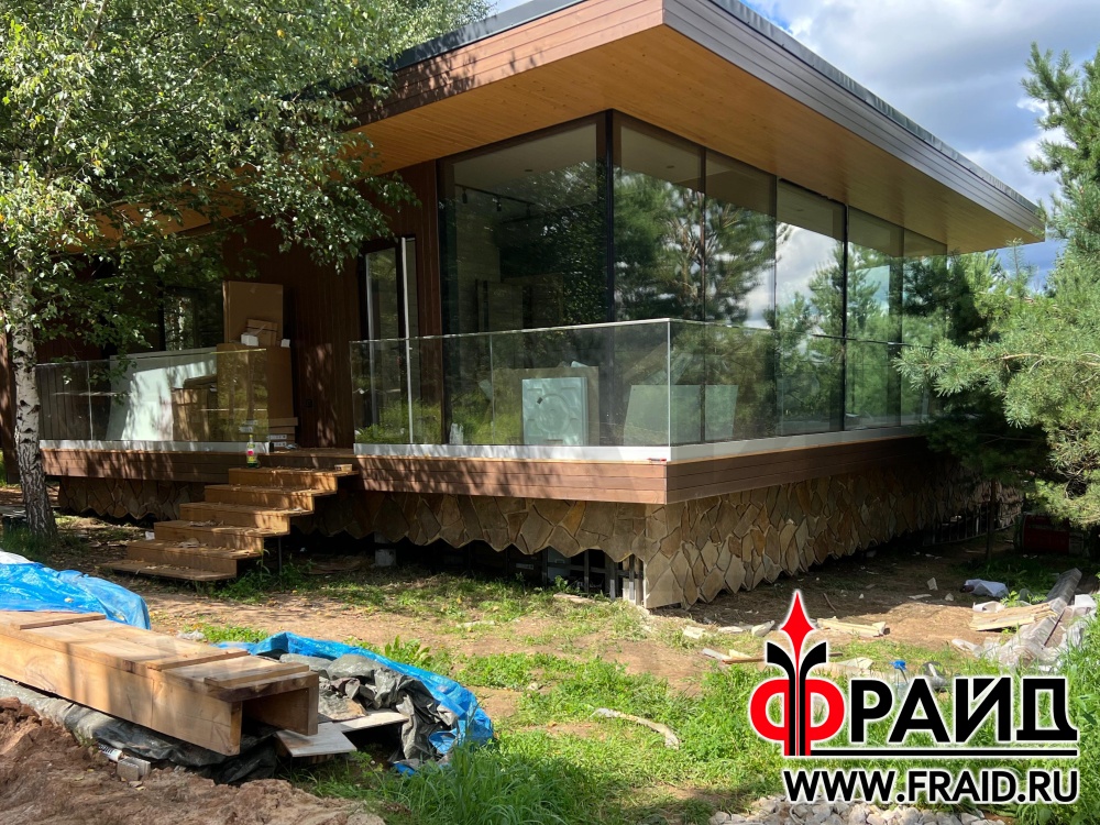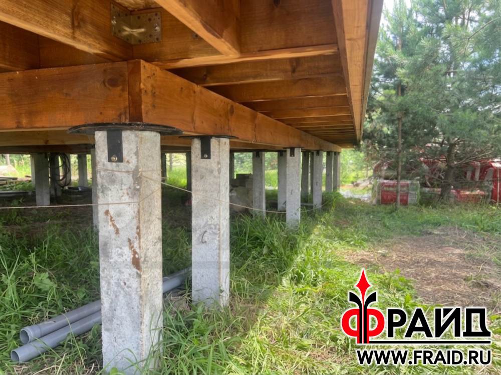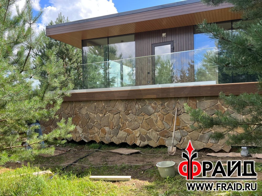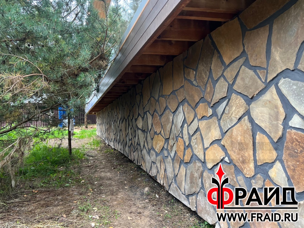 Отделка цоколя дома на бетонных сваях. Термопанели Фрайд Премиум с ростовским желто серым песчаником.